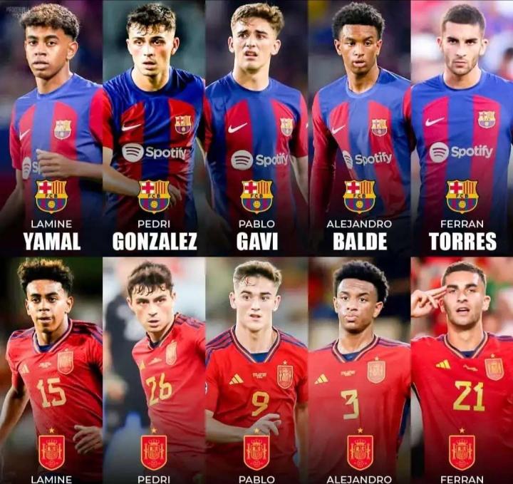 🇪🇸 亚马尔(16岁, 右边锋) 🇪🇸 佩德里(...国际足球记录员 @懂球帝2023-10-15 22:11🇪🇸 亚马尔(16岁, 右边锋) 🇪🇸 佩德里(20岁, 中前卫) 🇪🇸 加维(19岁,中前卫) 🇪🇸 巴尔德(19岁, 左边后卫) 🇪🇸 费兰·托雷斯(23岁, 右边锋)展开更多