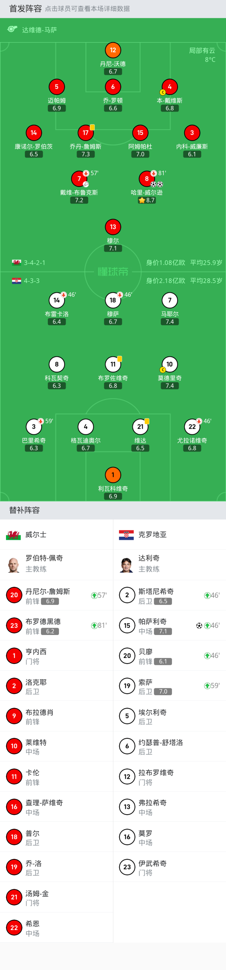 威尔士首发:12-丹尼-沃德, 4-本-戴维斯, 13-穆尔, 8-哈里-威尔逊, 7-戴维-布鲁克斯, 14-康诺尔-罗伯茨, 6-乔-罗顿, 15-阿姆帕杜, 5-迈帕姆, 3-内科-威廉斯, 17-乔丹-詹姆斯