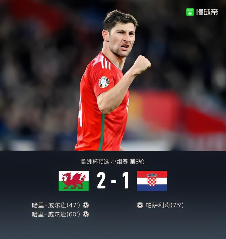 北京时间10月16日欧洲杯预选 小组赛 第8轮,威尔士主场对阵克罗地亚。威尔士哈里-威尔逊梅开二度。克罗地亚帕萨利奇破门。最终比分2-1。