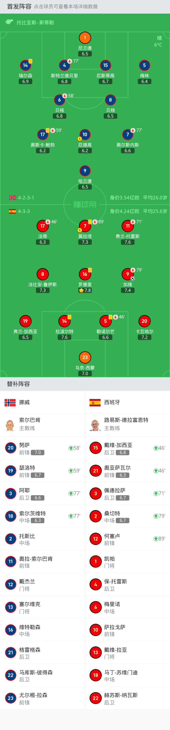 挪威首发:1-尼兰德, 4-斯特兰德贝里, 7-奥尔斯内斯, 6-贝格, 5-梅林, 10-厄德高, 8-贝格, 14-瑞尔森, 9-哈兰德, 15-厄斯蒂高, 17-奥斯卡-鲍勃