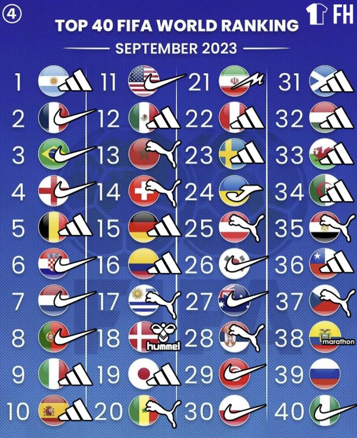 一图带你了解FIFA排名前40国家队球衣赞助商分布足球装备迷阿贤 @懂球帝2023-10-16 10:35FIFA世界排名前40名的国家队球衣赞助商分布,耐克、阿迪达斯和彪马占据其中的35支球队。展开更多