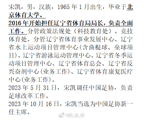 2023年5月31日,辽宁省体育局局长宋凯调任中国足协负责足球改革工作。