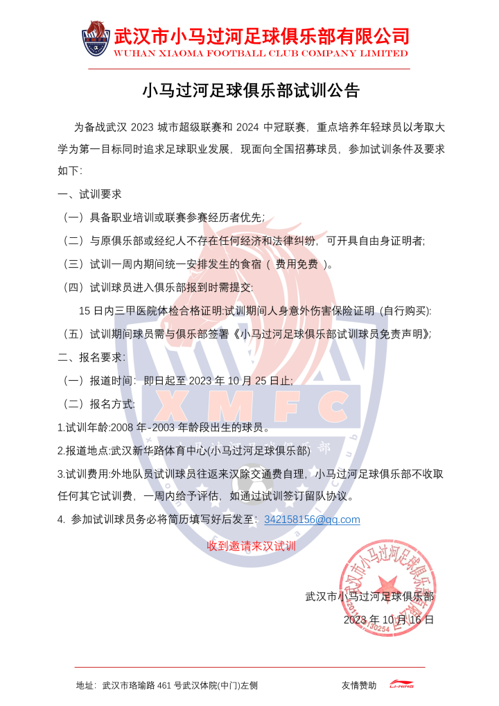 武汉市小马过河足球俱乐部试训公告 小马过河FC 小马过河FC2023-10-16 15:41武汉市小马过河足球俱乐部,为征战2023城市超级联赛,2024年中冠联赛及全国城市联赛现俱乐部为补充完善球员结构,经俱乐部研究决定,现面向全社会招聘优秀足球运动员。展开更多