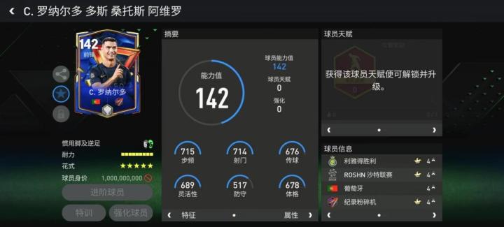 他的身体素质得到空前加强,实战时的对抗效果极为突出,可以从容应对铲抢与身体碰撞。他的射术依旧突出,头球与接应传中能力是版本首屈一指的存在,毫无疑问,这张C罗依旧是游戏中不可多得的顶尖射手。