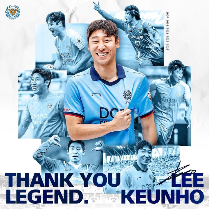 2021年,李根镐选择“叶落归根”,最终荣归故里大邱。对于很多有着足球梦的85后来说,李根镐其实是他们心中的“白月光”,是在孙兴慜之前的绝对偶像。而在本赛季,38岁的李根镐也多次在大邱危难之际挺身而出,为球队带来胜利。截止到目前,李根镐共在K联赛出场385场,攻入80球并有35次助攻,代表国家队也有84场19球的成绩。2023赛季结束后,李根镐整整球员生涯经历了20年,是韩国真正的传奇球员。12月3日,大邱FC主场与仁川联合的比赛前,将进行李根镐的退役仪式,到那个时候,我们再正式和他说“再见”!