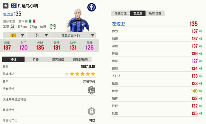 22U赛季里顶级左后卫云集,不仅有特奥这种老牌的“左后一哥”,还有许多新冒头的“飞翼”。来自国米的迪马尔科就很受玩家们喜欢,他有超快的速度,可以在锋线和卫线间反复飞奔,承包左路区域的攻防任务。迪马尔科带球也不会放慢多少速度,能持球推进,建议给他装备“煲汤”助教,在得球反击后开冲。