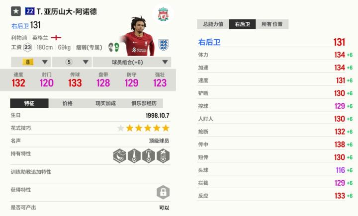 22U阿诺德的工资高了些,在强力边后卫众多的22U套和英格兰套,23工资并不占优。这张22U阿诺德更适合利物浦套用,他有很好的速度和带球手感,还可以充当边前卫,视为射门弱化版的小贝。