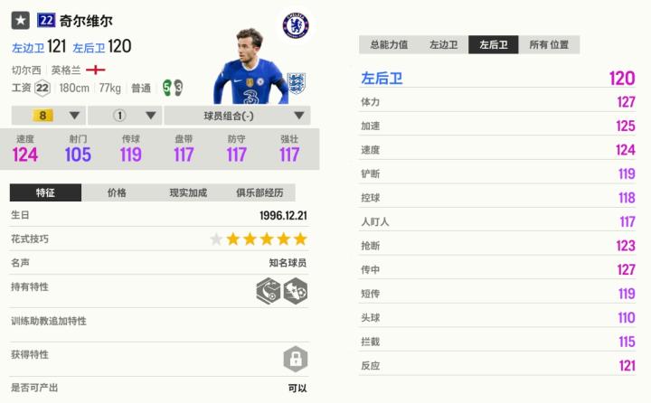 使用奇尔维尔要多让他到进攻前沿,奇尔维尔的套边意识好,接到传球后能顺势起高球传中,他的传中弧线不错,能满足传中党的要求。22U奇尔维尔在队套加成作用下,射门力量能到130以上,有射门空间的时候,可以大力蒙一脚,也许能创造补射的机会。