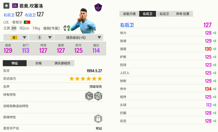 与现实一样,坎塞洛最强的是擅长各类传球。他的传球精度堪比纯正后腰和边前卫,与边后卫比有点“降维打击”的意思。坎塞洛双足给的也好,逆足都有4,后场被压迫下也能稳定把球送出去,减少后场的失误。