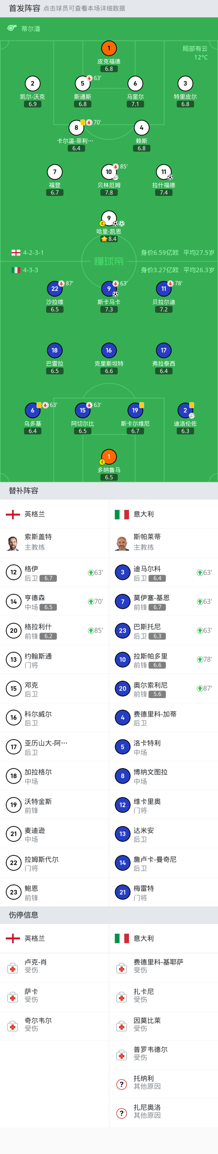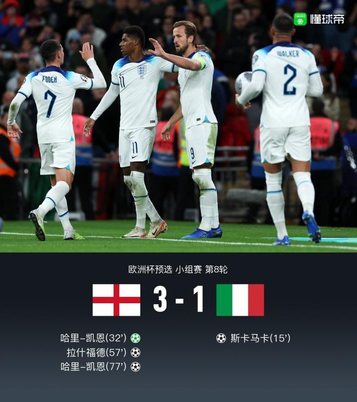 英格兰3-1双杀意大利,贝林厄姆造点+助攻拉什福德,凯恩双响