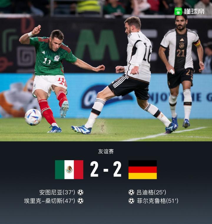 北京时间10月18日友谊赛,墨西哥在美国的林肯金融体育场对阵德国。上半场德国队角球机会,吕迪格头球破门,之后穆勒破门越位,随后安图尼亚将比分扳平。下半场埃里克-桑切斯头球破门反超比分,随后菲尔克鲁格补射破门扳平比分。最终德国2-2战平墨西哥。
