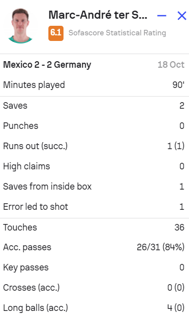 特尔施特根本场比赛完成2次扑救,1次出击并成功,另有1次失误导致对方射门。36次触球,31脚传球,传球成功率84%。