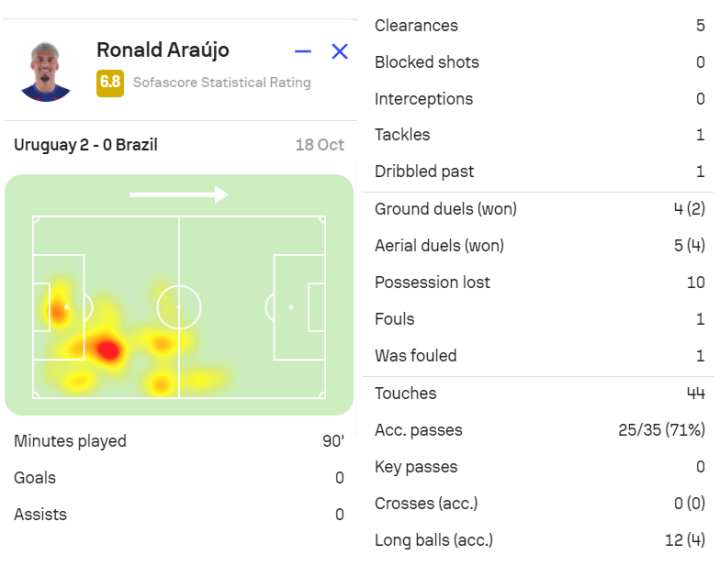 阿劳霍本场比赛完成1次抢断和5次解围。44次触球,35脚传球,传球成功率71%。