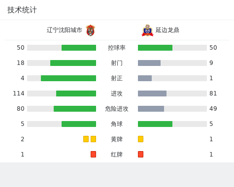 北京时间10月18日中甲 联赛 第27轮,辽宁沈阳城市主场对阵延边龙鼎。上半场比赛进行到第10分钟,姜峰助攻闵银瀚破门先拔头筹,第23分钟,瓦尔杜马尔门前手球阻挡对手头球,裁判出示直红,随后刘子铭操刀点射破门扩大比分,比赛第84分钟,毛开宇禁区外拉拽犯规阻碍进攻,裁判出示直红。全场战罢,最终比分2-0。