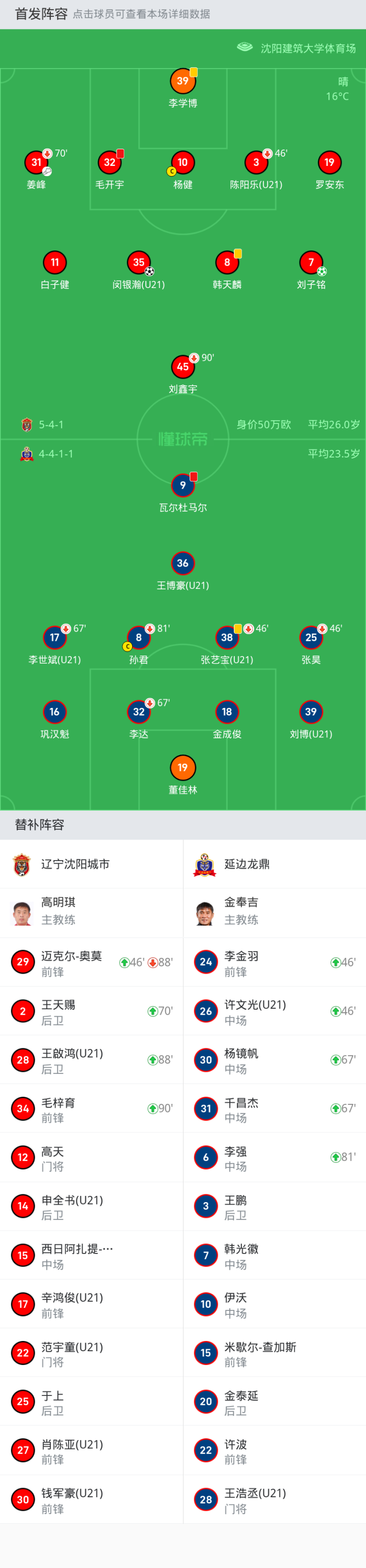 替换下场:90'+245-刘鑫宇, 70'31-姜峰, 46'3-陈阳乐(U21)