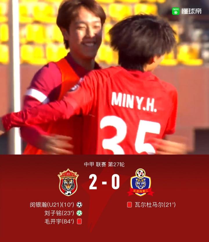 辽宁沈阳城市2-0延边龙鼎,刘子铭破门,闵银瀚建功
