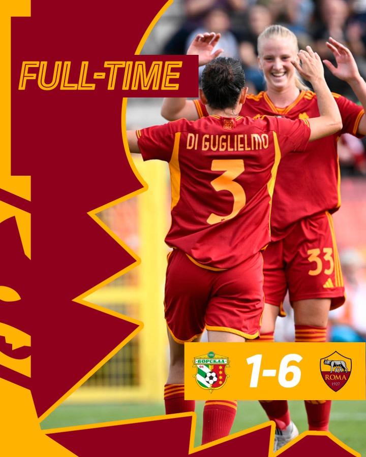 🍃秋风扫落叶!🔥刚刚结束的女子欧冠预赛第二轮次回...罗马足球俱乐部 @懂球帝2023-10-18 22:37🍃秋风扫落叶! 🔥刚刚结束的女子欧冠预赛第二轮次回合,罗马女足凭借迪·古列尔莫的梅开二度、薇安和拉托蕾的进球以及对方的两次自摆乌龙,客场6-1横扫波尔塔瓦沃尔斯克拉。 💪两回合总比分9-1,我狼女足昂首挺进女子欧冠小组赛阶段!展开更多