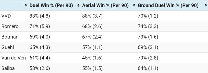 罗梅罗(71% )、博特曼(69% )、马克·盖伊(65% )和范德文(61% )等竞争对手的中后卫在对抗成功率方面不如范戴克。虽然这些后卫拥有良好的数据,但范戴克在对抗时所表现出的统治力却是独一档的。
