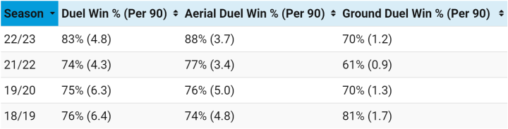 在经历了糟糕的上赛季之后,这位利物浦队长在本赛季开始了强劲的表现。范戴克场均有4.8次对抗,在地面对抗中的成功率高达 70%,在空中对抗中的胜率高达 88%。与上赛季相比,范戴克的防守侵略性有所提高,防守时也更加积极主动。