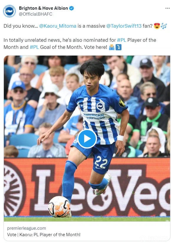 【三笘薫竟是霉霉的小迷弟!选择22号球衣的原因也与偶像有关!】 布莱顿的日本边锋三笘薫延续了上赛季的火热表现,大有竞争新一代“亚洲一哥”的势头,而“三球王”的偶像是谁呢?答案是泰勒-斯威夫特。 三笘薰曾经透露了自己的一个小秘密——他的22号球衣背后有着特别的故事。他表示:“我的22号球衣背后的故事?我一直是泰勒-斯威夫特的超级粉丝,这是我最喜欢的她的歌曲(歌曲名为22),22在我的背上激励我尽我所能,她是我最大的灵感来源。” 泰勒-斯威夫特是国际顶级歌坛天后,今年3月的泰勒-斯威夫特“时代之旅”巡回演唱会已产生50亿美元(约合364亿元人民币)的经济影响,超过35个国家的GDP。以每场演出的平均上座72459人为标准,仅门票收入就有22亿美元(约合160亿元人民币),这使得“时代之旅”成为有史以来收入最高的巡演。 由于演唱会带来的经济效益非常高,这种现象也被美媒称为“霉霉经济学”。
