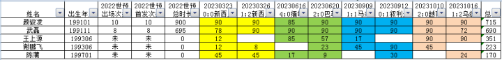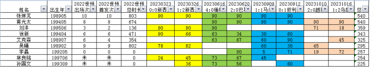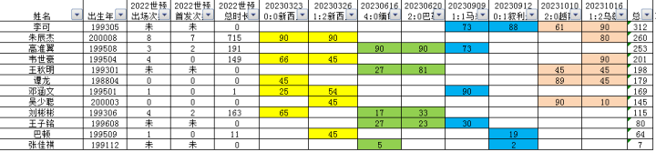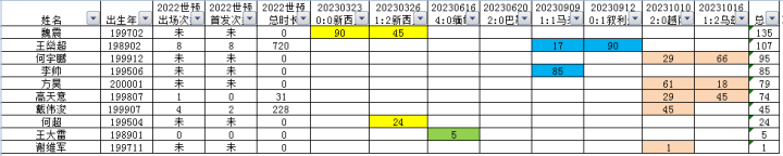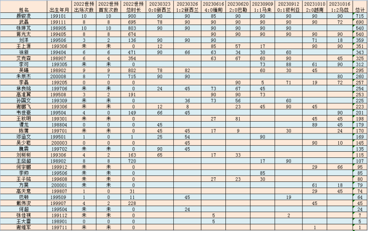 2022世预赛的出场次数、首发次数、出场时间均为12强赛的数据。其中出场次数、首发次数为0的是入选过名单单位出场的,出场次数、首发次数标注“未”的,是未入选过名单的。
