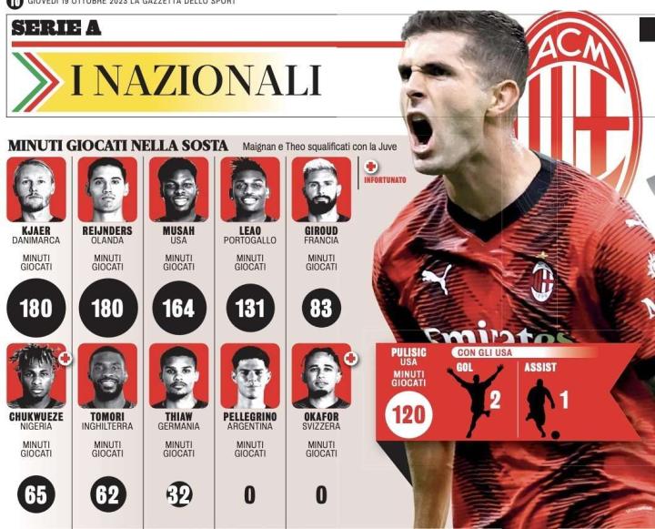 米兰体育报统计了本次国家队比赛日AC米兰队内国脚...Rossoneri_03 @懂球帝2023-10-19 21:17米兰体育报统计了本次国家队比赛日AC米兰队内国脚的出场时间,其中克亚尔和赖因德斯均首发打满两场,普利希奇总计出场120分钟贡献2球1助攻。展开更多