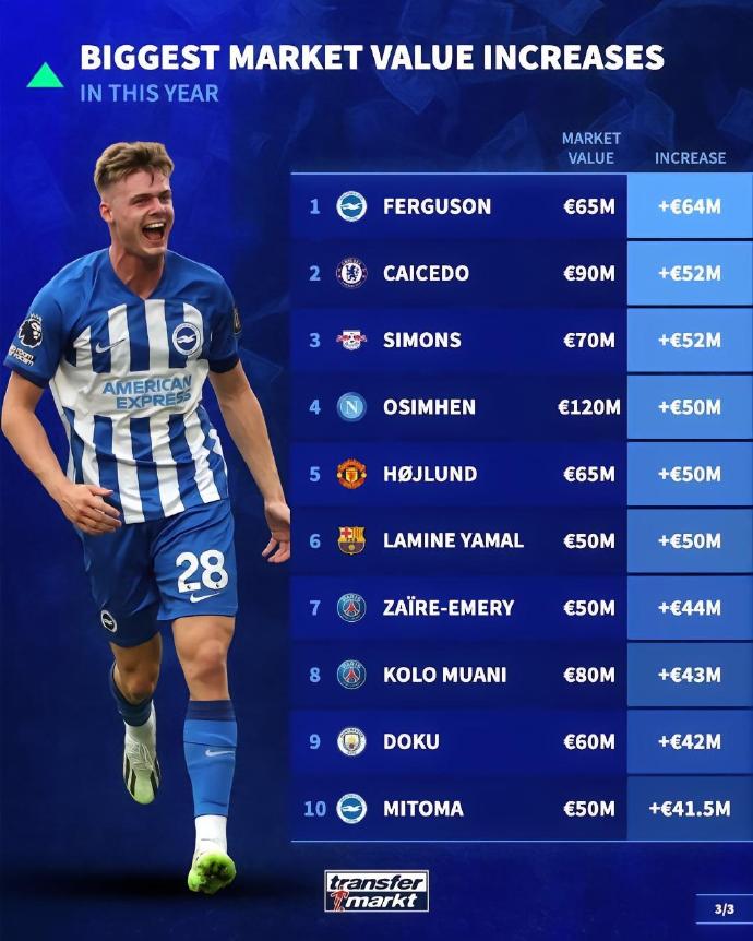 德转数据统计,五大联赛球员本年度身价涨幅排行前10,详情如下: 1.弗格森6500万欧元,涨幅6400万欧元 2.凯塞多9000万欧元,涨幅5200万欧元 3.哈维-西蒙斯7000万欧元,涨幅5200万欧元 4.奥斯梅恩1.2亿欧元,涨幅5000万欧元 5.霍伊伦6500万欧元,涨幅5000万欧元 6.亚马尔5000万欧元,涨幅5000万欧元 7.扎伊尔-埃梅里5000万欧元,涨幅4400万欧元 8.科洛-穆阿尼8000万欧元,涨幅4300万欧元 9.多库6000万欧元,涨幅4200万欧元 10.三沾薰5000万欧元,涨幅4150万欧元