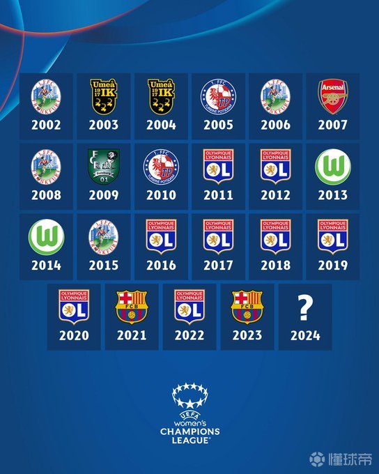 历届女足欧冠冠军,里昂八冠断崖式领先。2024年...