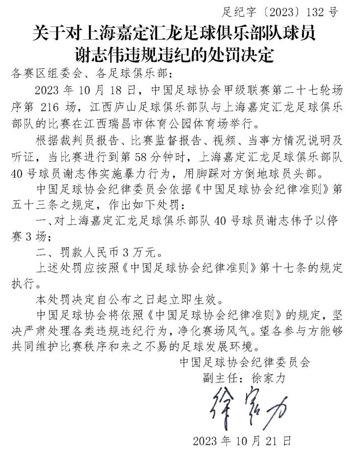 处罚决定书中提到,根据裁判员报告、比赛监督报告、视频、当事方情况说明及听证,当比赛进行到第58分钟时,上海嘉定汇龙足球俱乐部队40号球员谢志伟实施暴力行为,用脚踩对方倒地球员头部。中国足球协会纪律委员会依据《中国足球协会纪律准则》第五十三条之规定,作出如下处罚:
