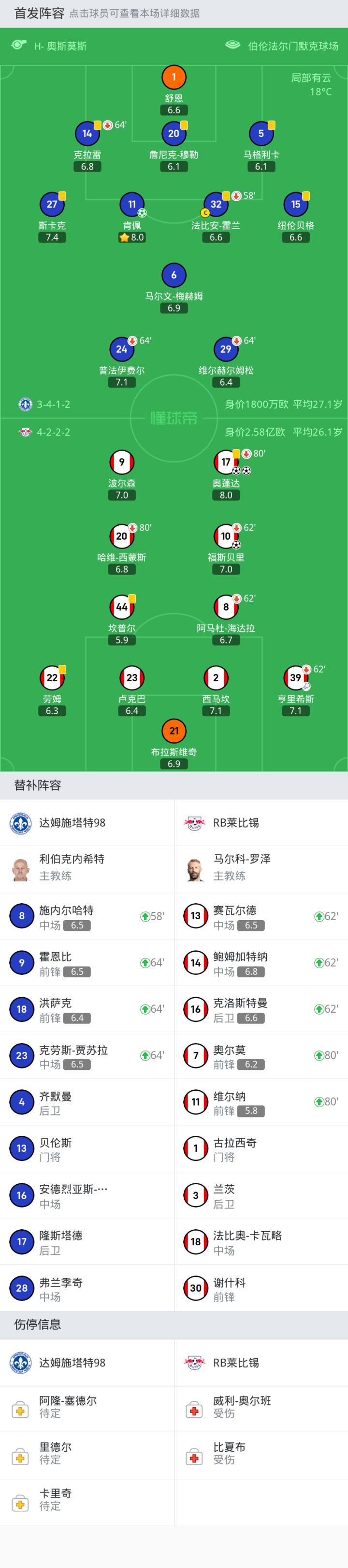 RB莱比锡首发:10-福斯贝里, 21-布拉斯维奇, 44-坎普尔, 9-波尔森, 39-亨里希斯, 22-劳姆, 8-阿马杜-海达拉, 17-奥蓬达, 2-西马坎, 23-卢克巴, 20-哈维-西蒙斯