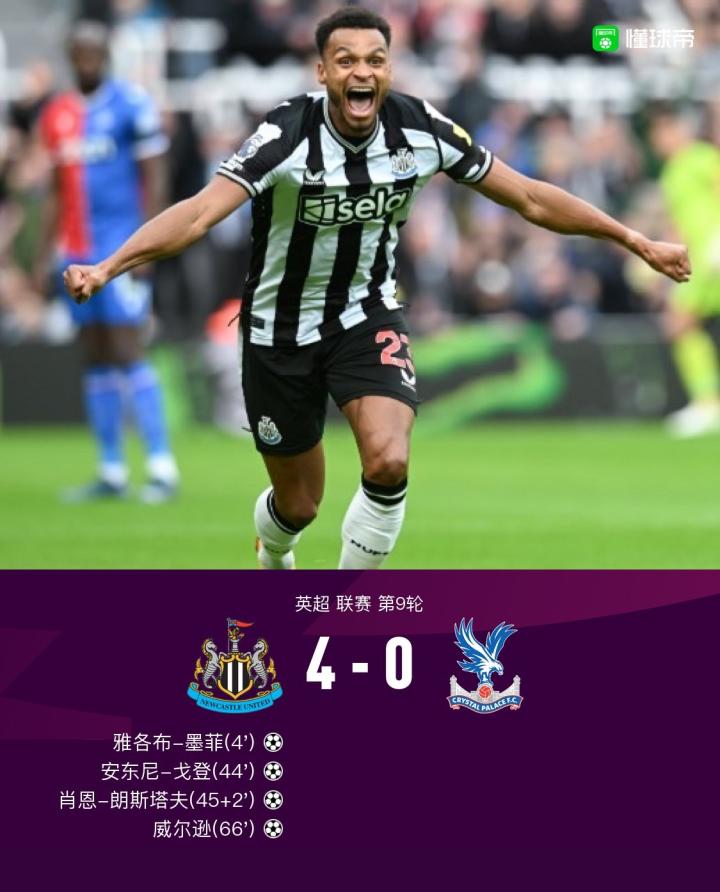 北京时间10月21日英超 联赛 第9轮,纽卡斯尔联主场对阵水晶宫。上半场,特里皮尔助攻墨菲凌空挑射破门,约翰斯通扑球失误,戈登面对空门打在横梁上,墨菲精准制导助攻戈登破门,特里皮尔长传造成格伊失误,朗斯塔夫断球后破门;下半场,威尔逊反击中推射入网,爱德华任意球打门被波普飞身单手扑救。最终比分4-0。