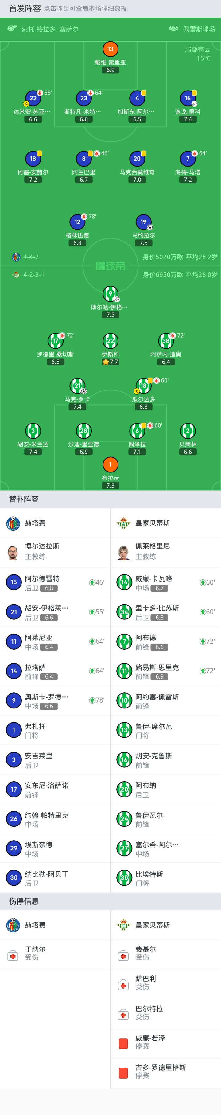 皇家贝蒂斯首发:18-瓜尔达多, 1-布拉沃, 22-伊斯科, 6-佩泽拉, 2-贝莱林, 9-博尔哈-伊格莱西亚斯, 21-马克-罗卡, 3-胡安-米兰达, 17-罗德里-桑切斯, 28-沙迪-里亚德, 38-阿萨内-迪奥