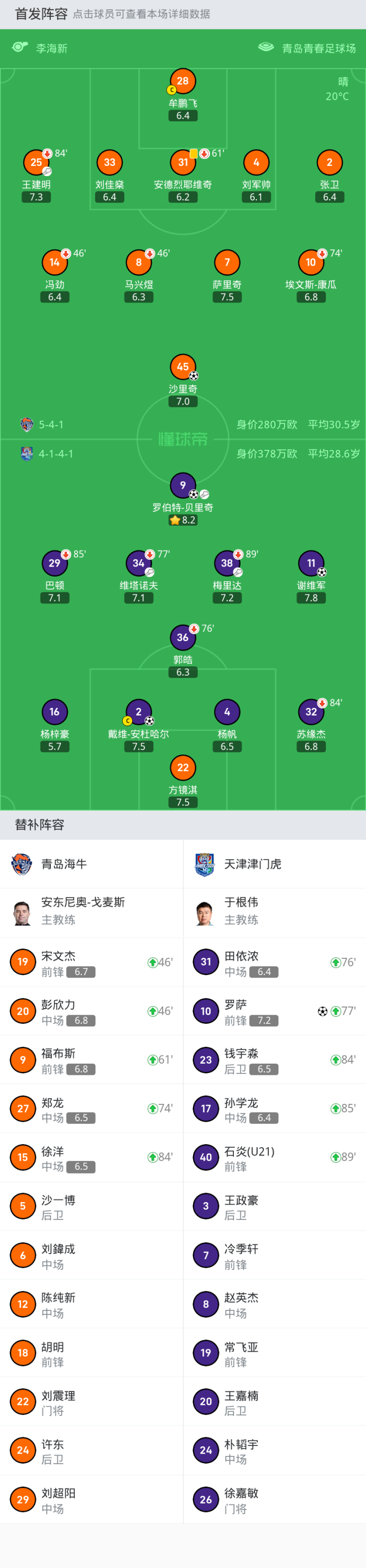 上场替补:77'10-罗萨, 76'31-田依浓, 84'23-钱宇淼, 85'17-孙学龙, 89'40-石炎(U21)