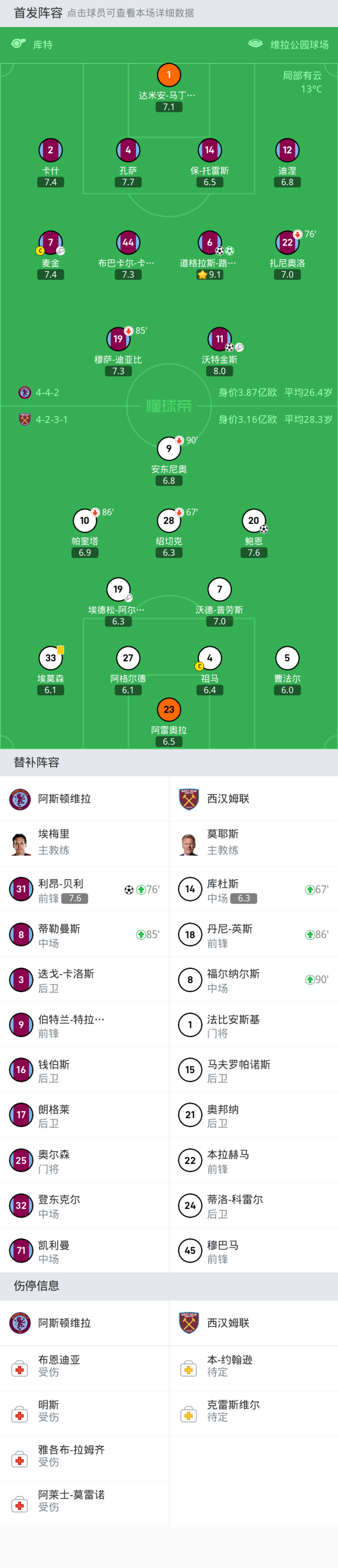 阿斯顿维拉首发:1-达米安-马丁内斯, 12-迪涅, 7-麦金, 11-沃特金斯, 14-保-托雷斯, 44-布巴卡尔-卡马拉, 4-孔萨, 2-卡什, 6-道格拉斯-路易斯, 22-扎尼奥洛, 19-穆萨-迪亚比