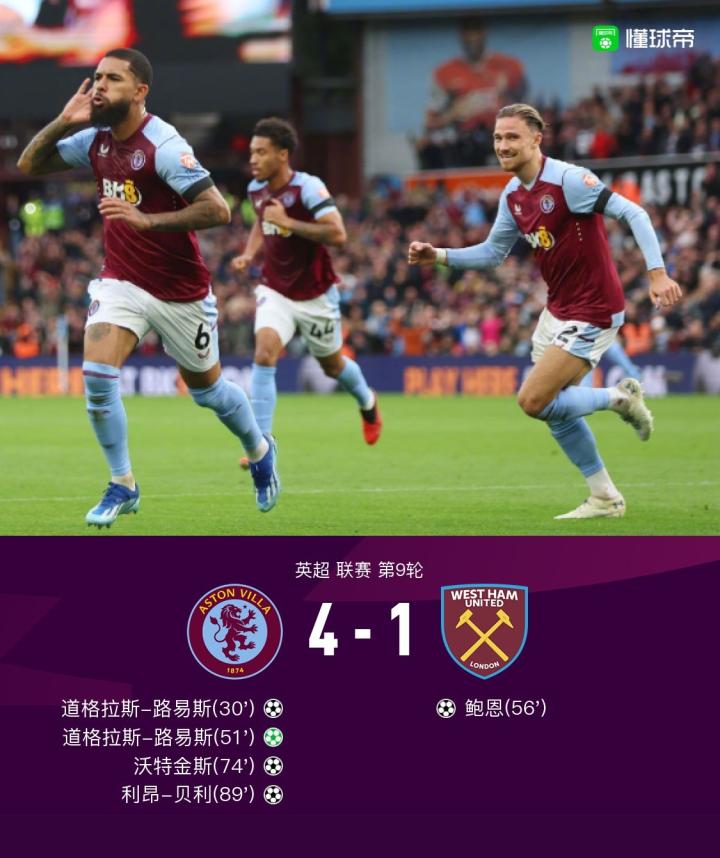 北京时间10月22日英超 联赛 第9轮,阿斯顿维拉主场对阵西汉姆联。上半场第30分钟,沃特金斯助攻道格拉斯-路易斯率先完成破门,下半场第55分钟,孔萨造点,道格拉斯-路易斯操刀点射梅开二度,比赛在第57分钟,鲍恩抽射命中防守队员产生变线扳回一城,74分钟,麦金送出助攻,沃特金斯调整劲射破门将比分扩大,比赛尾声阶段,蒂勒曼斯连线利昂-贝利替补建功,全场战罢,最终比分锁定在4-1。