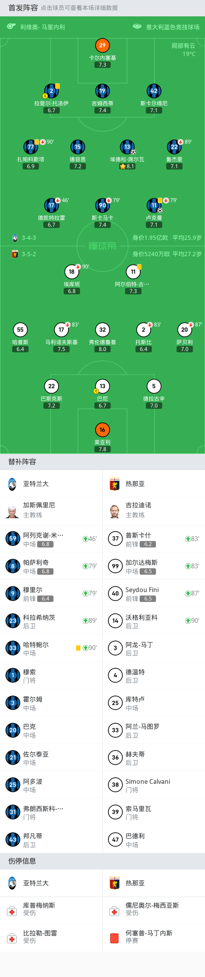 亚特兰大首发:2-拉斐尔-托洛伊, 15-德容恩, 19-吉姆西蒂, 77-扎帕科斯塔, 90-斯卡马卡, 11-卢克曼, 29-卡尔内塞基, 13-埃德松-席尔瓦, 17-德凯特拉雷, 22-鲁杰里, 42-斯卡尔维尼