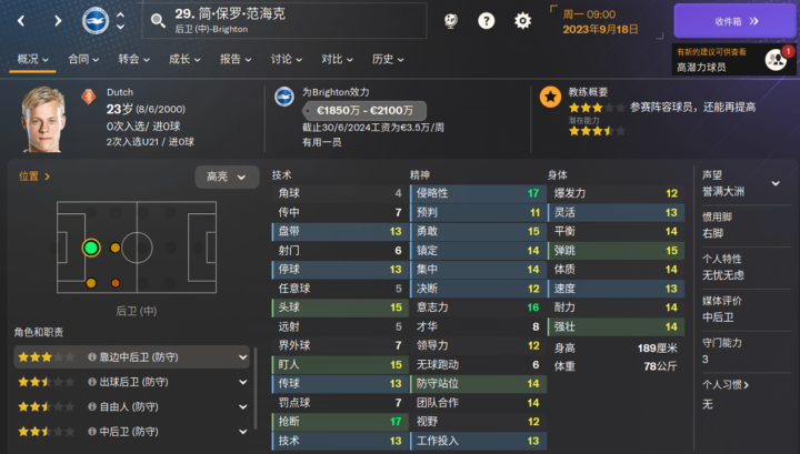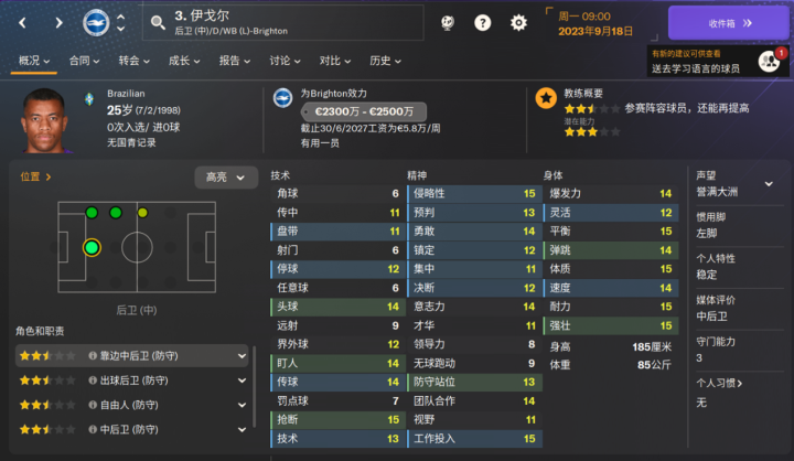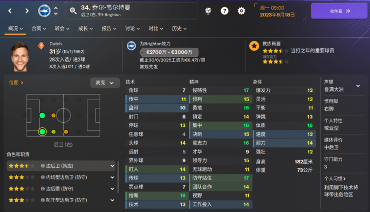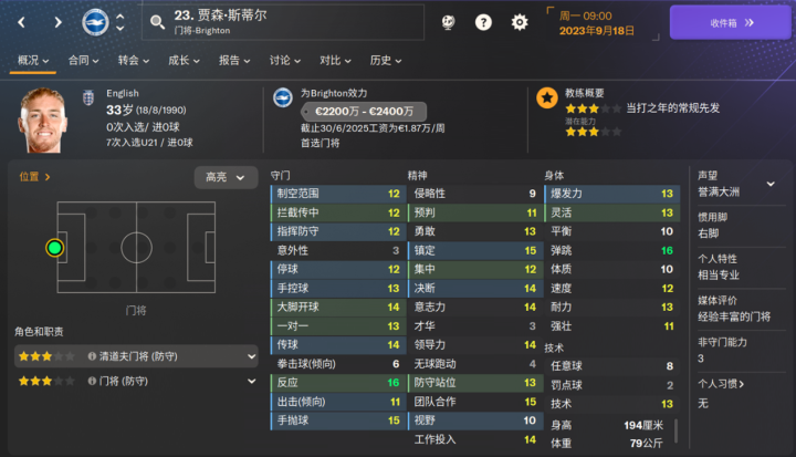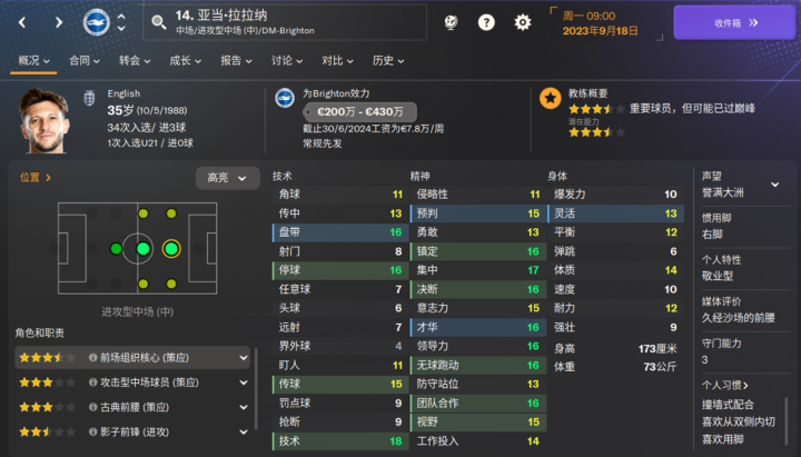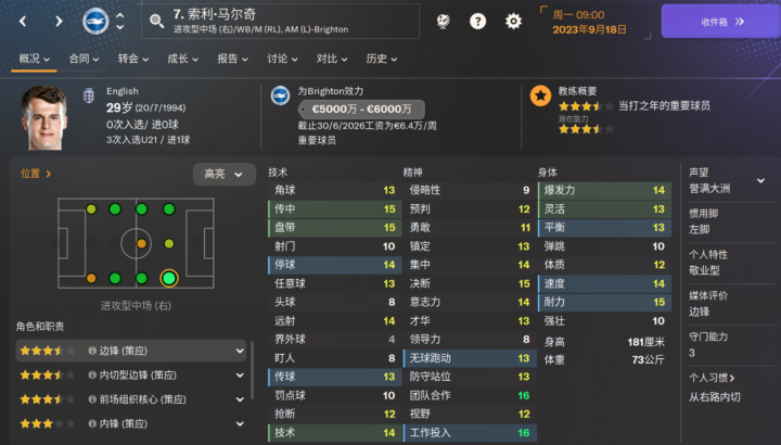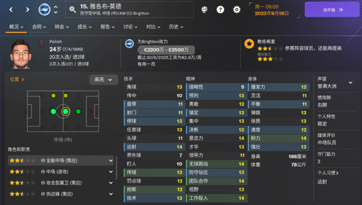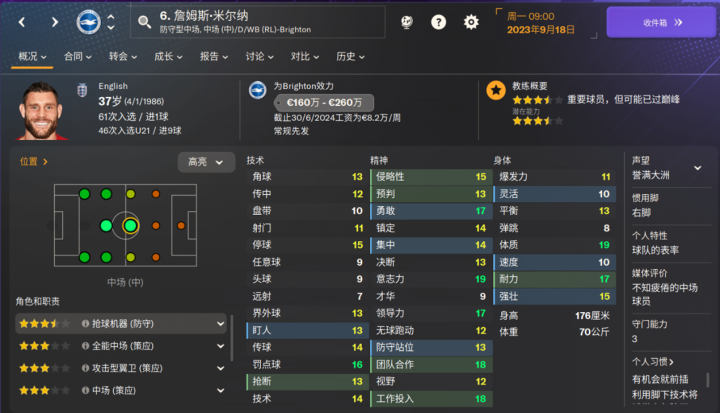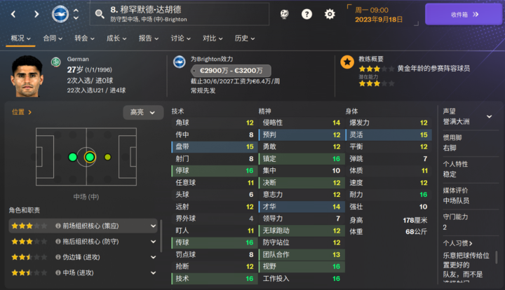 海鸥新援,为数不多的布莱顿的降低潜力值的球员之一,新赛季表现也比较一般。