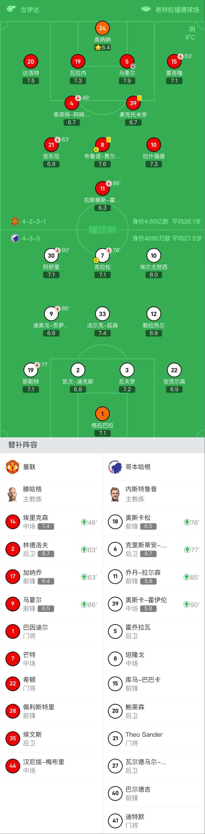 曼联首发:24-奥纳纳、20-达洛特、19-瓦拉内、5-马奎尔、15-雷吉隆(63'2-林德洛夫)、39-麦克托米奈、4-阿姆拉巴特(46'14-埃里克森)、21-安东尼(63'17-加纳乔)、8-B费、10-拉什福德、11-霍伊伦(86'9-马夏尔)