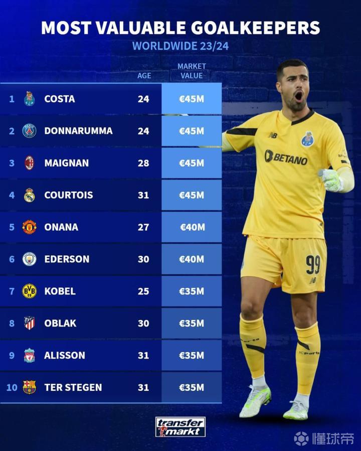【门将身价排行:迪奥戈-科斯塔、多纳鲁马等人4500万欧居首】
