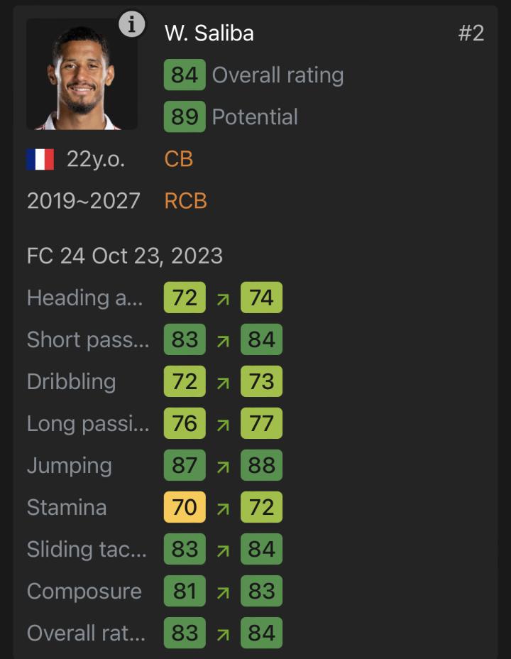 FC24阿森纳更新:萨利巴能力值升至84