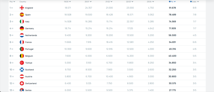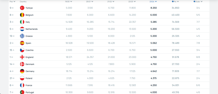 本赛季积分土耳其和比利时分列前二,五大联赛中意甲第三,西甲第六,英超第八,德甲第十,法甲第十二。