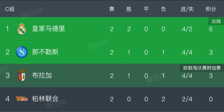 皇马2战全胜,高居小组第一,上轮客场战胜了小组最强对手那不勒斯,本轮面对布拉加难度不大,应该可以取胜并争取以小组第一出线。那不勒斯面对各项赛事已经八连败的柏林联合,如果能主客场双杀对手,可以以小组第二出线。这个小组的看点是布拉加和柏林联合谁将以小组第三参加欧联附加赛,谁将垫底回家。
