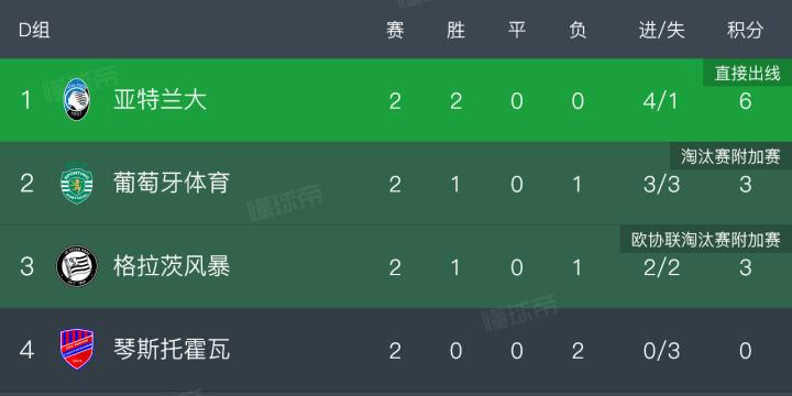 亚特兰大2战2胜占据优势,上轮更是客场战胜了小组最强对手葡萄牙体育,牢牢占据小组第一,本轮客场面对格拉茨风暴看好不败。葡萄牙体育客场必须拿下小组最弱的琴斯托霍瓦,争取小组第二出线。