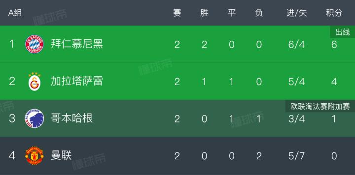 拜仁慕尼黑头名出线问题不大,焦点在于谁将以第二名出线,加拉塔萨雷的概率远高于曼联,哥本哈根也不好打。本轮曼联如果没有拿下哥本哈根,极有可能降级至欧联参加淘汰赛附加赛,甚至垫底回家。