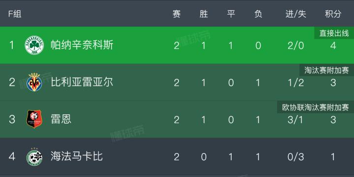 比利亚雷亚尔主场拿下小组最弱的海法马卡比问题不大,就看另一场比赛的结果,帕纳辛纳科斯目前占据主动,如能拿下雷恩,则有极大概率争取小组第一。