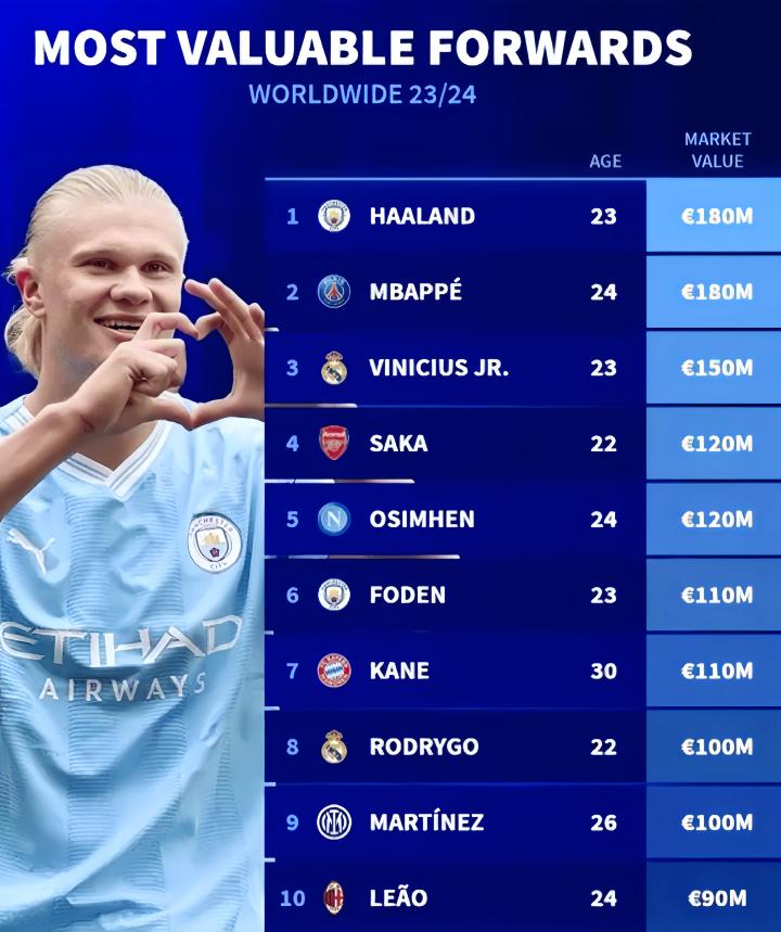 数说足球|权威数据网站transfermarket统计了当今世界足坛中,身价最高的30名前锋,哈兰德、姆巴佩并列榜首! 哈兰德、姆巴佩:1.8亿欧 维尼修斯:1.5亿欧 萨卡、奥斯梅恩:1.2亿欧 福登、凯恩:1.1亿欧 罗德里戈、劳塔罗:1亿欧 莱奥:9000万欧 科瓦拉茨赫利亚:8500万欧 马丁内利、胡利安-阿尔瓦雷斯、穆阿尼:8000万欧 拉什福德、热苏斯、路易斯-迪亚斯、萨内、格拉利什:7500万欧 哈维-西蒙斯、弗拉霍维奇、伊萨克:7000万欧 伊万-弗格森、霍伊伦、努涅斯、金斯利-科曼、萨拉赫:6500万欧 多库、戴维、拉菲尼亚:6000万欧 球迷朋友们觉得谁的表现最符合身价?又是谁的表现溢价过高?