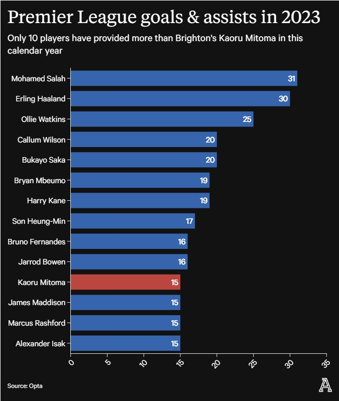 整个2023年(自然年),三笘薰制造了15粒进球,只有萨拉赫、哈兰德等10位顶级攻击手比他更多