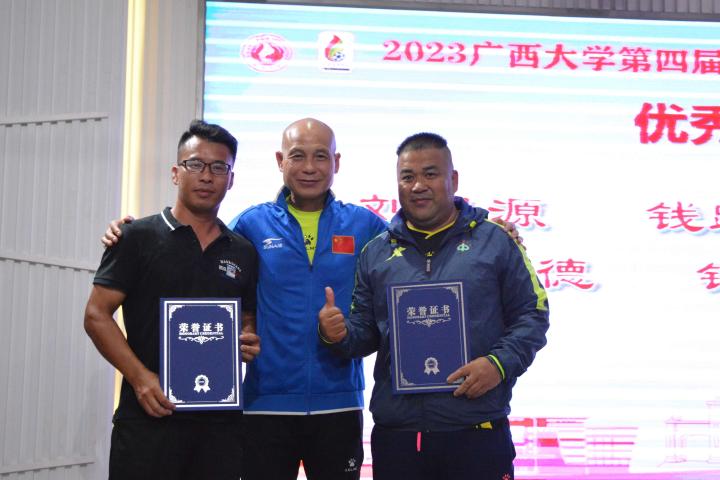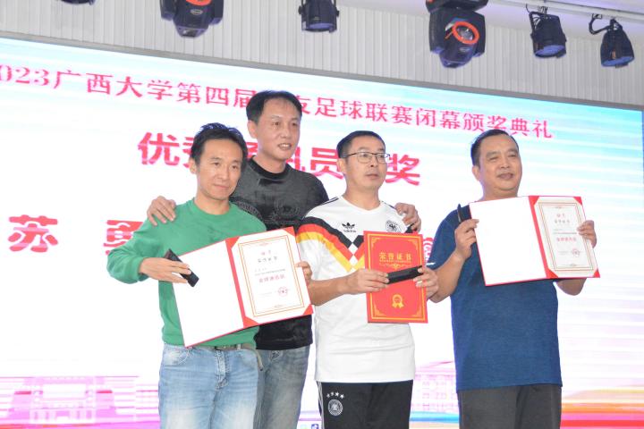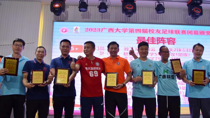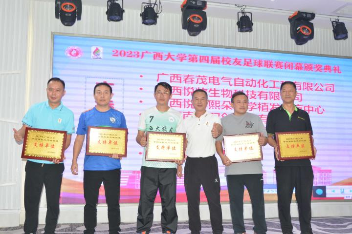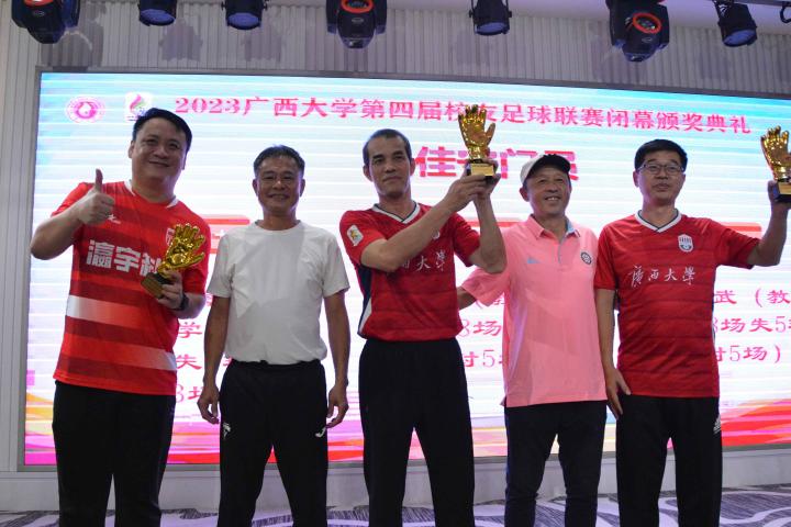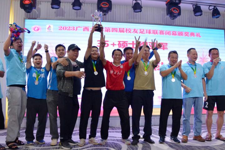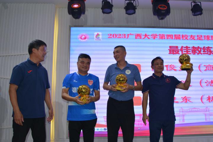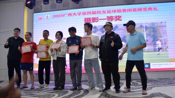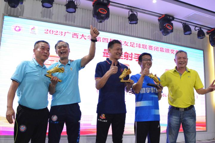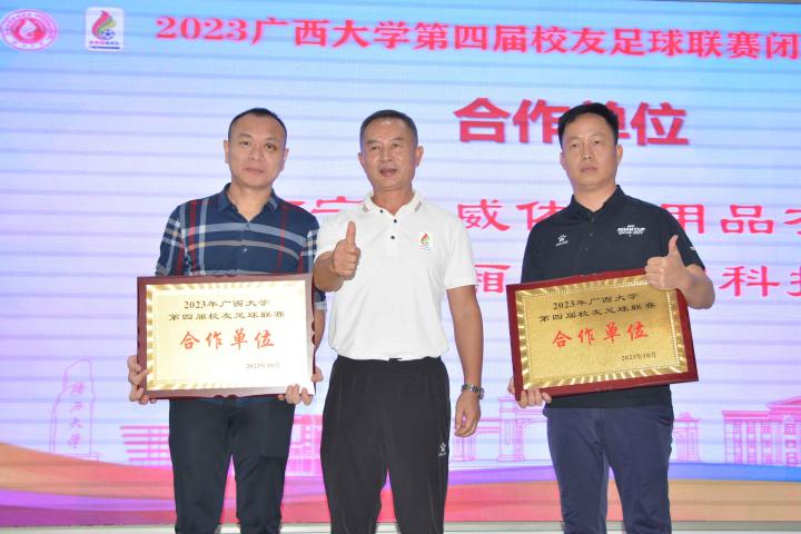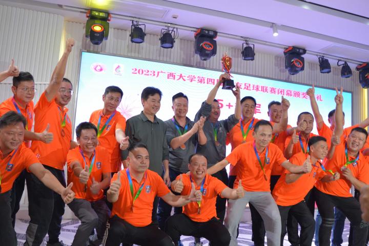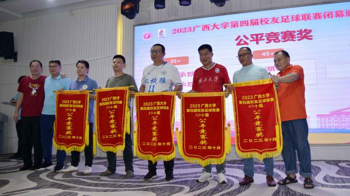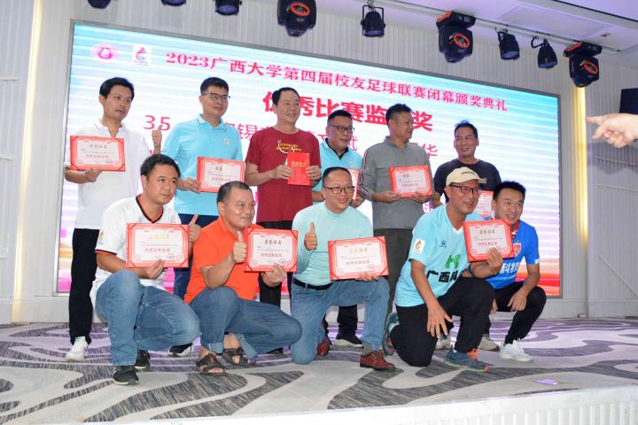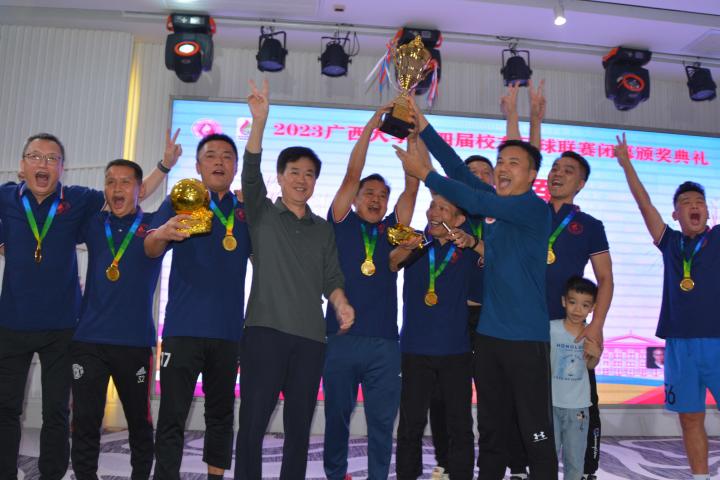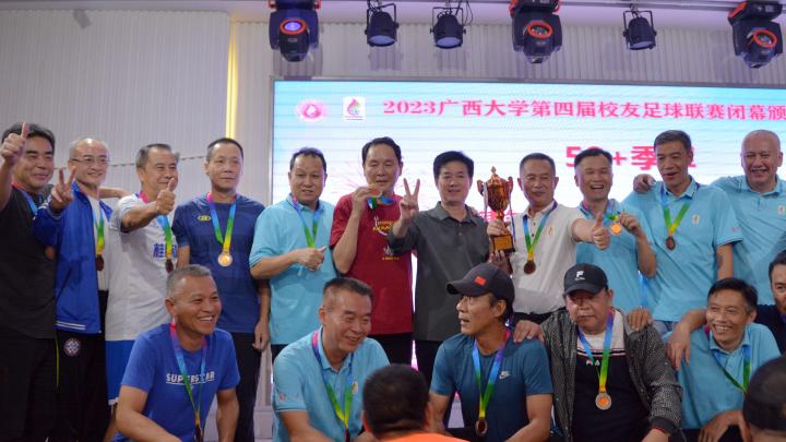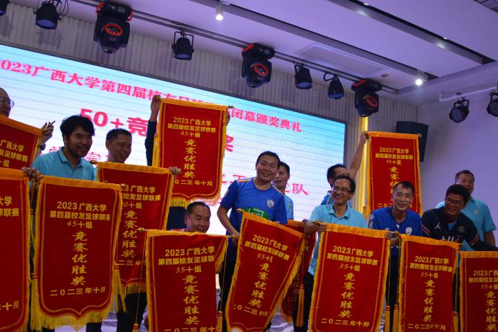 经过三个月的鏖战,风雨无阻,2023年广西大学第四届校友足球联赛终于完美落幕。10月21日晚,隆重的闭幕颁奖典礼在南宁市国宇大酒店举行,广西体育高等专科学校党委书记;广西大学足球队原主教练,周璋斌;广西大学法学院书记,余云宇;广西大学继续教育学院院长,苏兆成;广西足球队原教练,祝建明;广西资深青少年足球教练员,张愈荣;广西资深青少年足球教练员,钟青山;三位资深的前广西足球队球星:农梅辉、傅志能、黄福文。