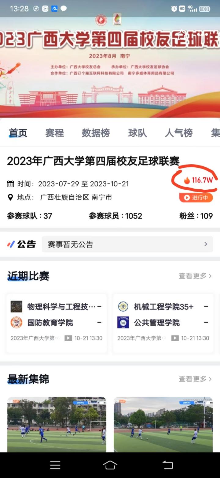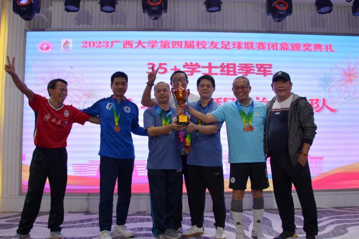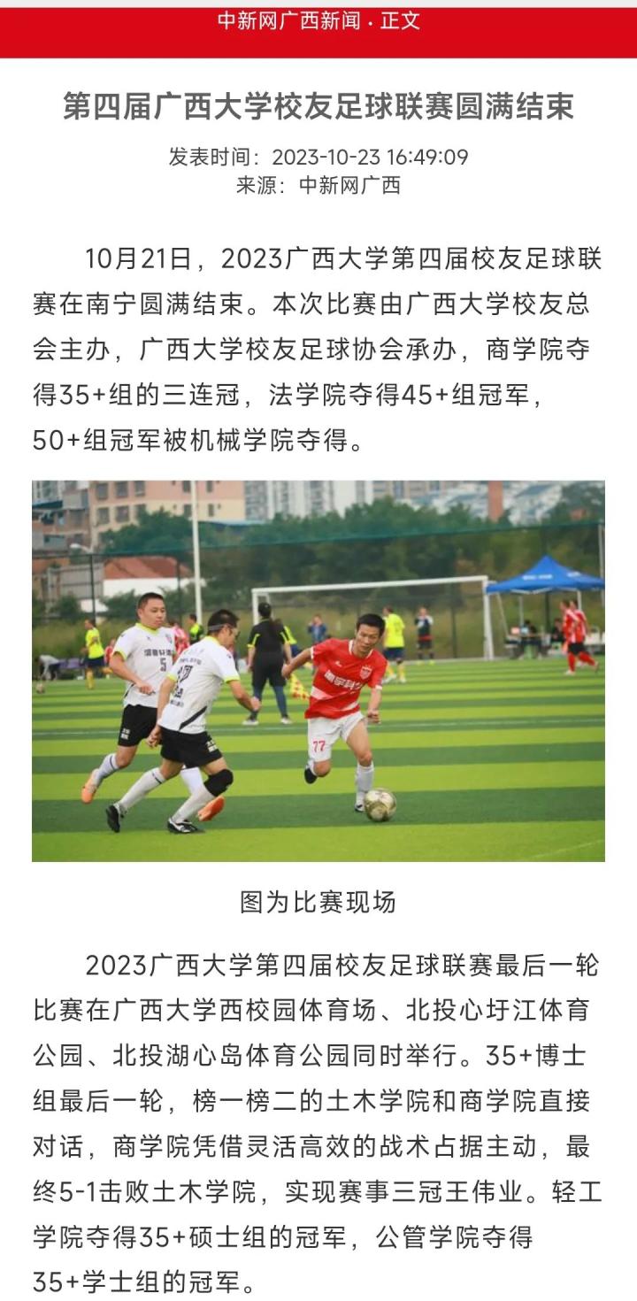 耀武酒肆工作室10月21日下午,以喜迎学青会,庆祝广西大学成立95周年为主题的“2023广西大学第四届校友足球联赛”在南宁圆满结束,本次比赛由广西大学校友总会主办,广西大学校友足球协会承办,商学院完成35+组的三冠王伟业,法学院夺得45+组冠军,50+组冠军被机械学院夺得。