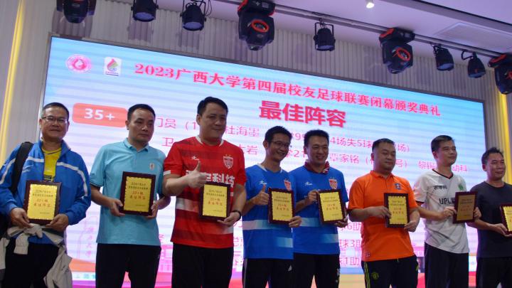 广西足协裁判委员会原主任,蓝壮旭;广西青年摄影家协会副主席徐冰老师;广西大画幅摄影学会理事邓明老师;广西大学校友足球协会荣誉会长,黄建平;广西大学校友足球协会会长,陈小林等领导、嘉宾莅临。各院联赛成员,联赛志愿者参加了本次闭幕式。本次比赛设立35+,45+,50+三个组别,共有37支球队1040名球员参赛。为了这精彩纷呈的比赛,球员们赛场上激烈角逐,工作人员辛勤付出,广大企业和校友给了我们最有力的支持。